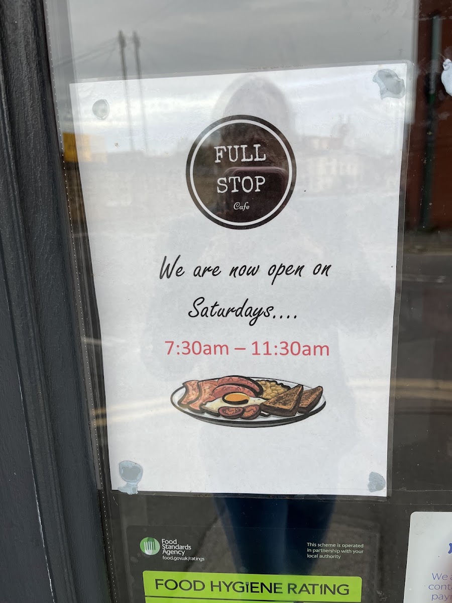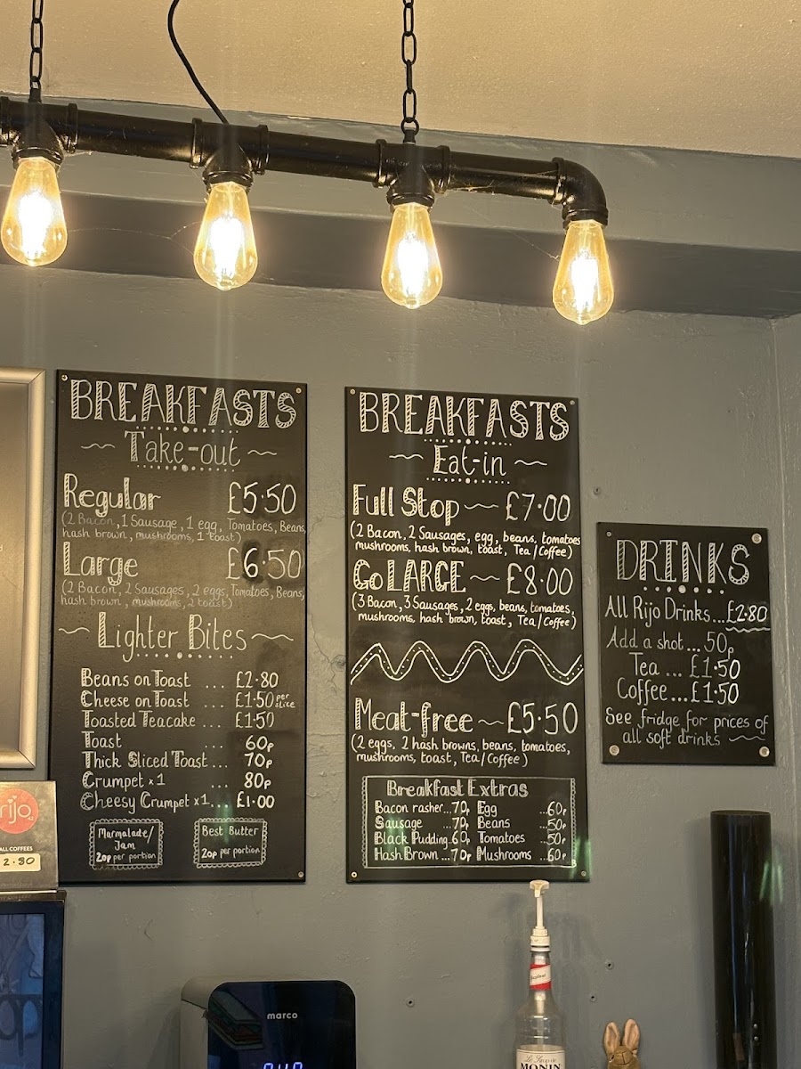 The menu at Full Stop Cafe features a selection of food and drinks typical of a traditional cafe setting. Visitors can find options suitable for breakfast, light meals, and coffee breaks, including both hot and cold items. The food offerings include sandwiches and breakfast-style items, with portions designed to satisfy moderate to larger appetites.